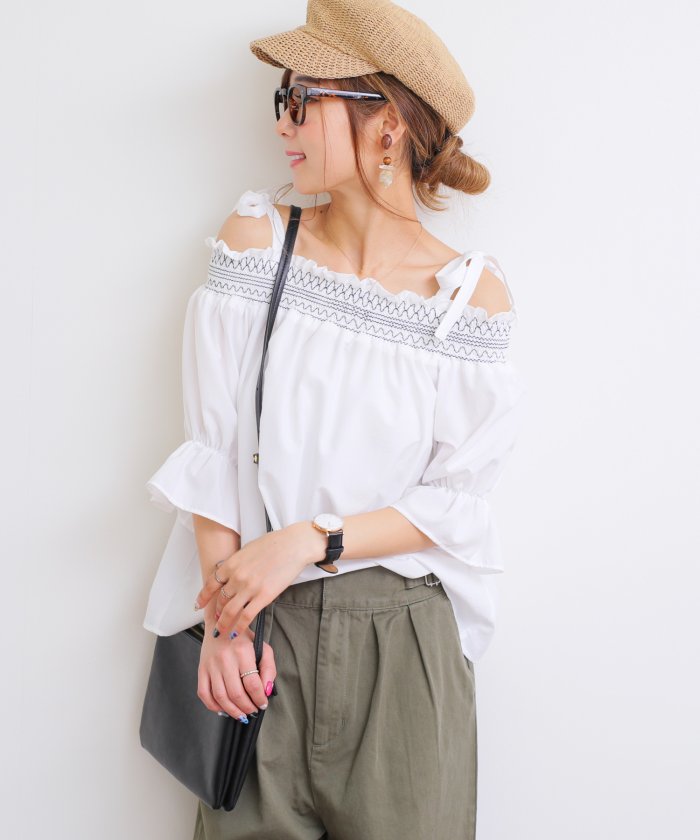マットな質感と、ほんのりツヤ感のある ビンテージ加工生地が軽くて爽やか! 刺繍入りオフショルブラウスが入荷しました♪ 胸元の刺繍部分はゴムシャーリング仕様。 お袖もゴム入りの楽ちんアイテムです。 肩ひもは取り外し不可の固定デザイン。 全体的にゆるっとしたサイジングで ふんわりとしたニュアンスが かわいいアイテムです♪ MODEL:身長158cm ※撮影時のライティング、ご覧になっているモニター・PC環境により 実際の商品と色味が異なって見える場合がございます。 ご了承の上お買い求め下さい。