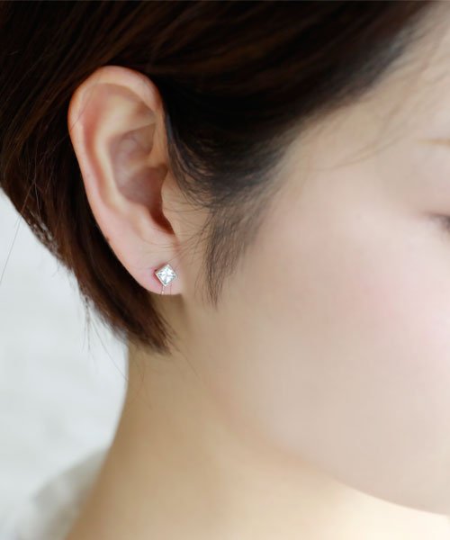 小さいながらも存在感のあるスクエアビジューが耳元を彩ります。