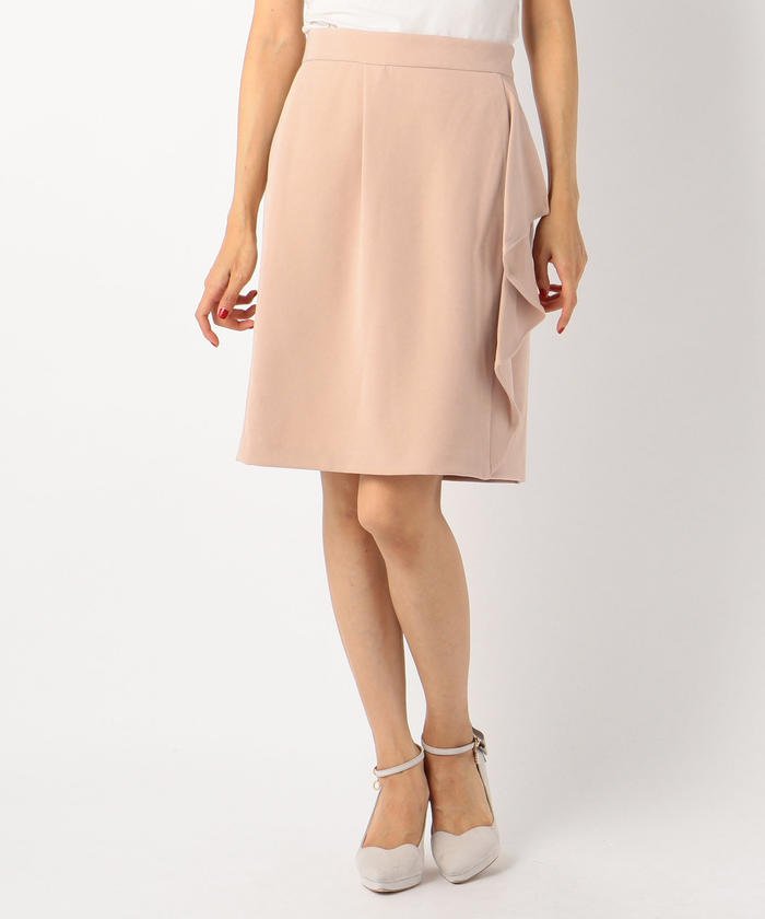 サイドに流れるラッフルフリルがデザインポイントになった、エレガントなタイトスカートです。バックウエストはリラックスして着こなせるゴム仕様。旬のトップスインスタイルもすっきり仕上がるのが嬉しいポイント。